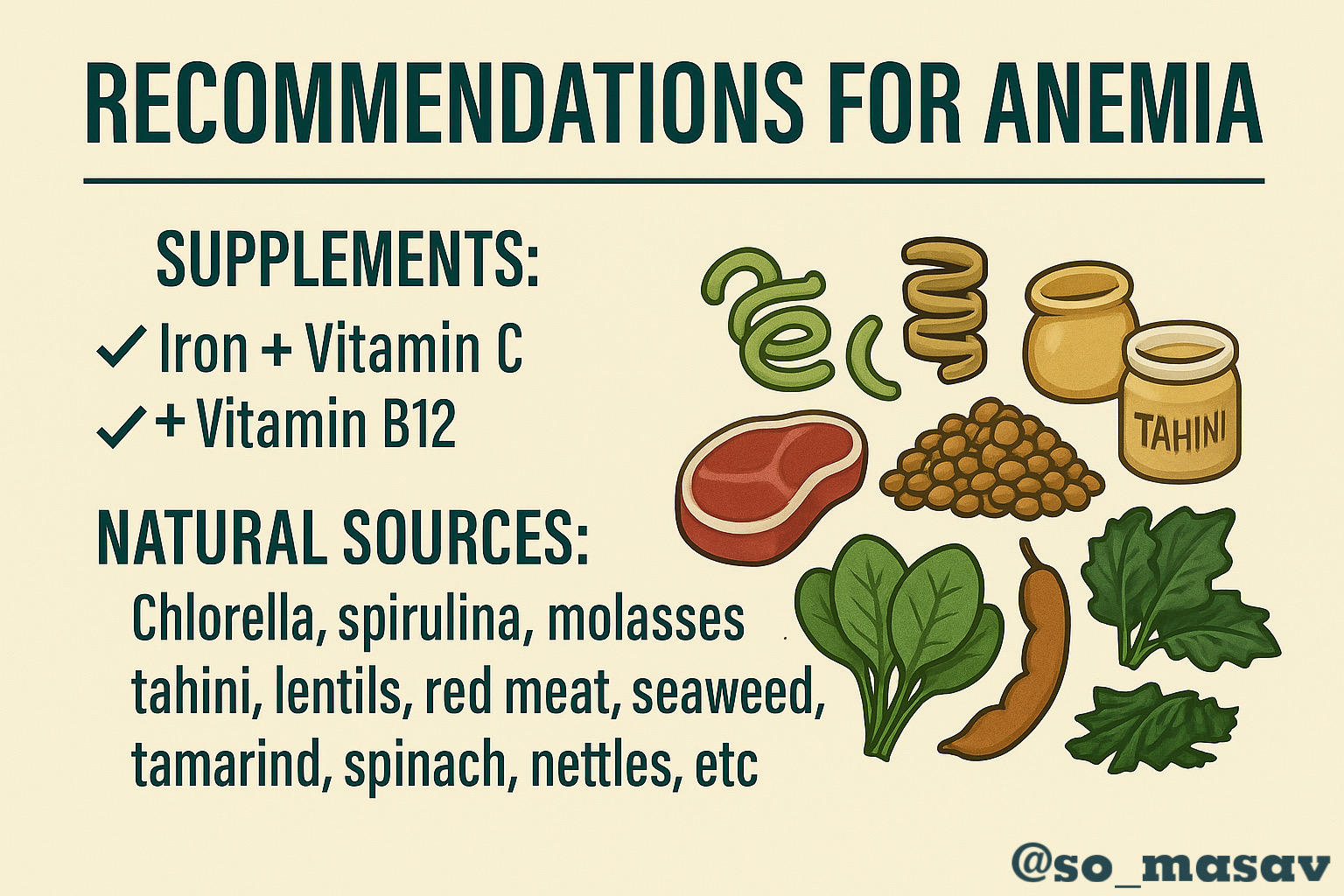 • Alimentation adaptée : Intégrer des aliments riches en fer (viande rouge, légumineuses, légumes verts) et en vitamine C pour favoriser l’absorption du fer.